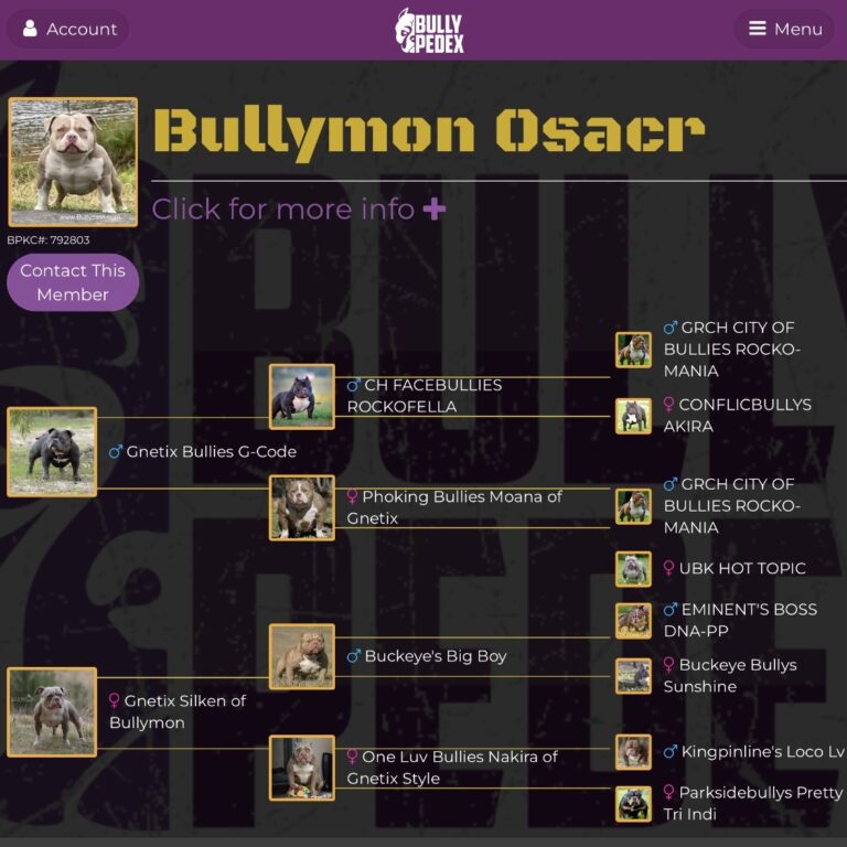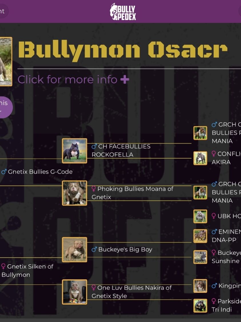Oscar standing under 14 inch at withers he is on the shorter spectrum of the American Bully Pocket class. Pedigree Bloodline consist of Gcode, Champion Grimm, Grand Champion Rocko, Boss Eminent, Buckeyes Big Boy, TheBullyCampLine Miagi, Loco Lv, HQ Pretty Boy
